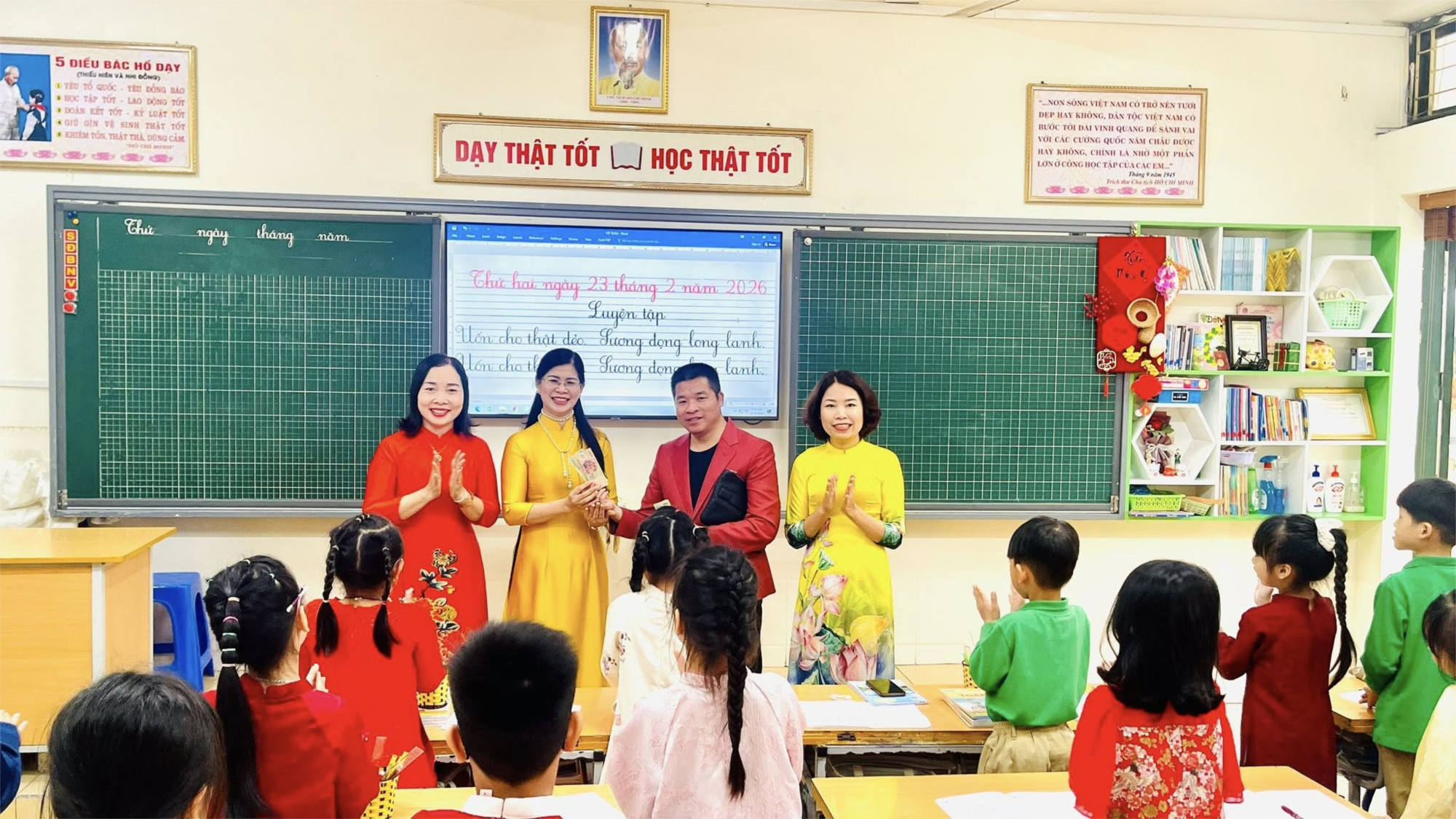 Các thầy cô trong Ban Giám hiệu đã trực tiếp đến thăm từng lớp. Những lời chúc mừng năm mới an khang, chăm ngoan, học giỏi được gửi gắm thân tình, ấm áp. Các em học sinh vui mừng, háo hức khi được nhận lì xì may mắn – món quà nhỏ nhưng chứa đựng nhiều yêu thương và kỳ vọng cho một năm học mới thành công.