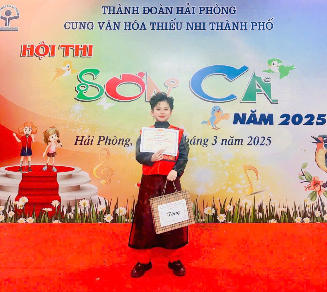 Ngày 29/3/2025, tại Hội thi “Sơn ca” thành phố Hải Phòng năm học 2024-2025, bạn Nguyễn Hoàng Trung Kiên – học sinh lớp 4A1, Trường Tiểu học Nguyễn Thượng Hiền – đã xuất sắc giành GIẢI NHẤT với bài hát “Mái đình làng biển”.