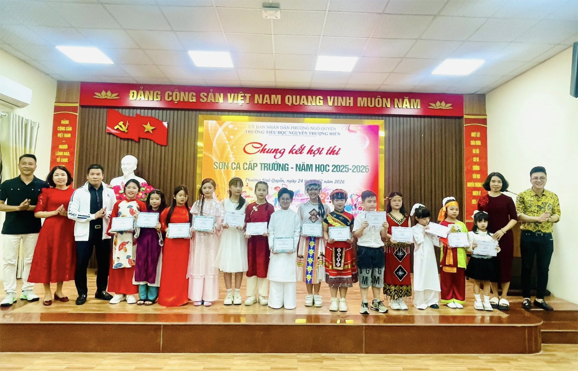 Vòng Chung kết Hội thi “Sơn ca” cấp trường năm học 2025-2026 đã diễn ra sôi nổi với sự tham gia của 14 thí sinh xuất sắc đã vươt qua vòng sơ khảo. Các em đã thể hiện niềm đam mê âm nhạc, sự tự tin và phong cách biểu diễn ấn tượng, để lại nhiều cảm xúc tốt đẹp trong lòng khán giả tham dự với kết quả như sau: