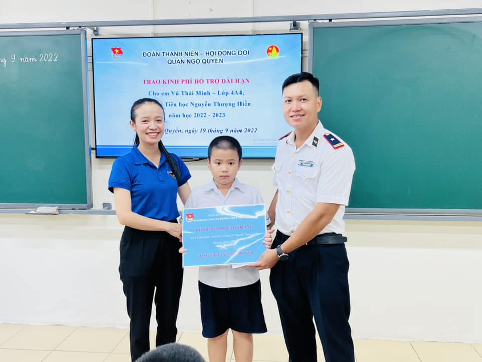 Sáng 19/9, Quận đoàn Ngô Quyền chỉ đạo Đoàn Thanh niên Cảng vụ đường thủy Nội địa khu vực I trao tặng học bổng dài hạn, hỗ trợ cho em Vũ Thái Minh - học sinh lớp 4A4 - Liên đội TH Nguyễn Thượng Hiền trong 10 tháng với tổng kinh phí là 5.000.000đ.