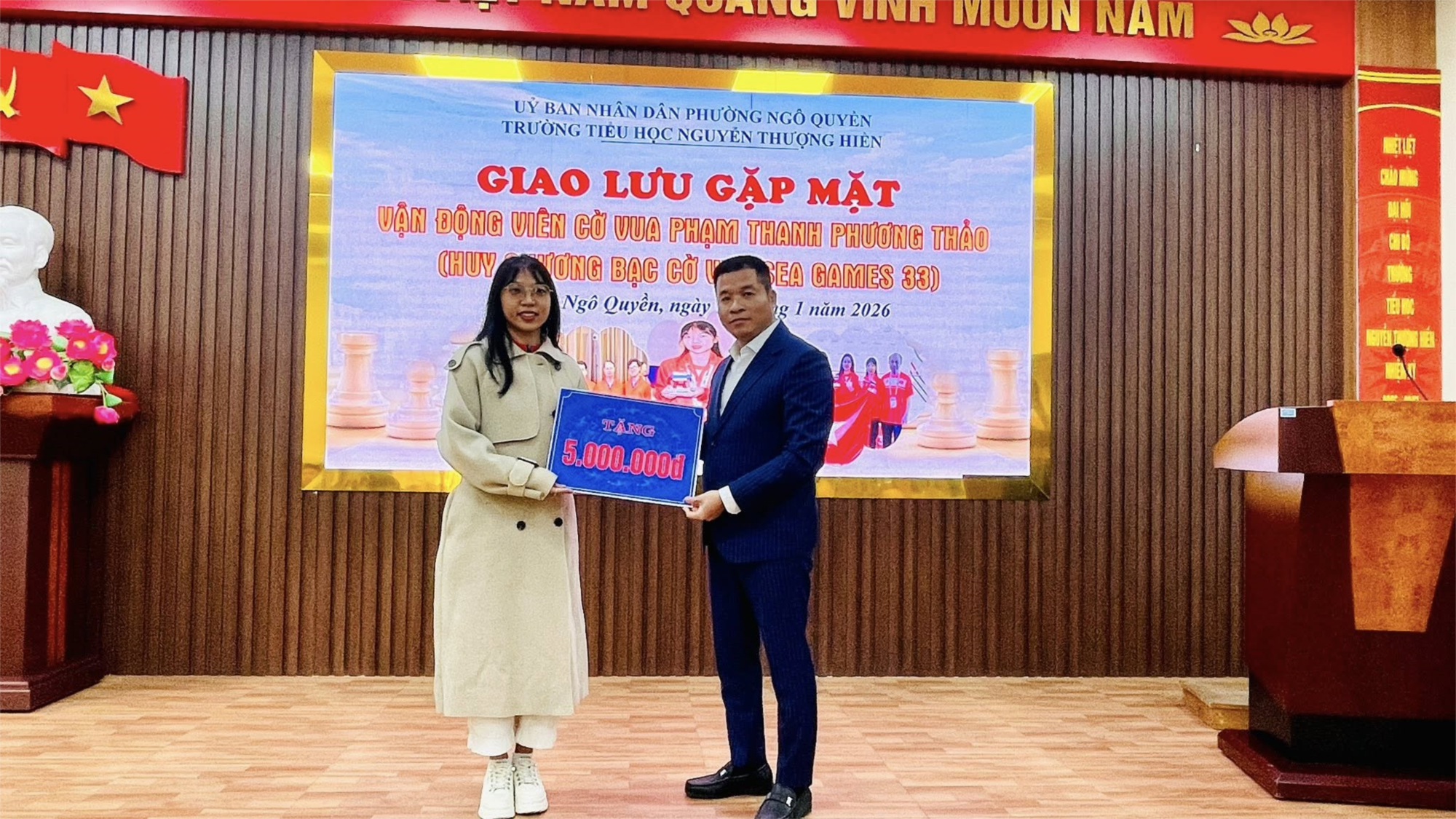 Tại buổi giao lưu, cá nhân thầy giáo Trần Nguyên Lâm – Bí thư Chi bộ, Hiệu trưởng nhà trường đã trao tặng món quà động viên trị giá 5.000.000 đồng tới vận động viên Phạm Thanh Phương Thảo, thể hiện sự trân trọng, ghi nhận và khích lệ đối với những nỗ lực, thành tích xuất sắc của cô.