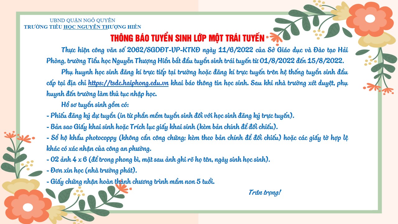 Thực hiện công văn số 2062/SGDĐT-VP-KTKĐ ngày 11/6/2022 của Sở Giáo dục và Đào tạo Hải Phòng, Trường Tiểu học Nguyễn Thượng Hiền bắt đầu tuyển sinh trái tuyến từ 01/8/2022 đến 15/8/2022.