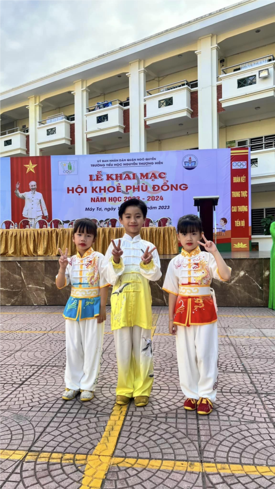 Bạn Lê Tâm Anh 1A4, Nguyễn Ngọc Hân 3A3 vận động viên Wushu nhỏ tuổi nhất tham gia biểu diễn tại lễ khai mạc Hội khoẻ Phù Đổng trường TH Nguyễn Thượng Hiền.