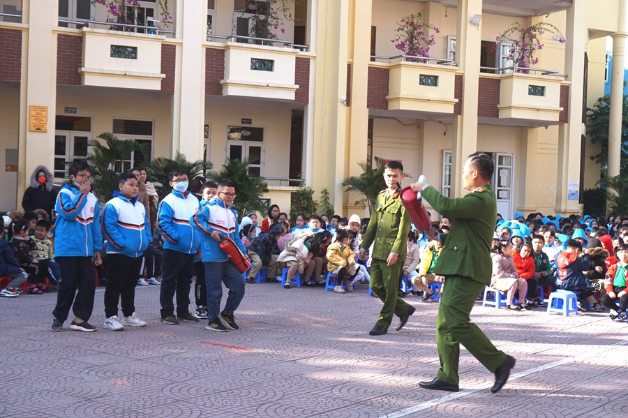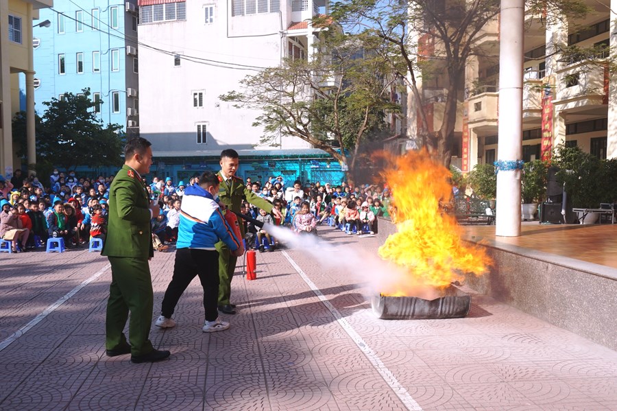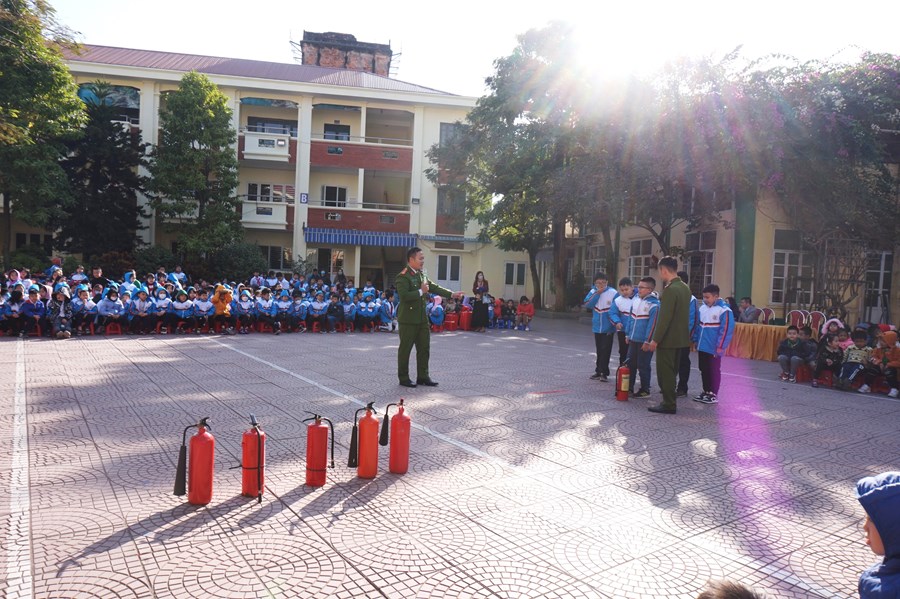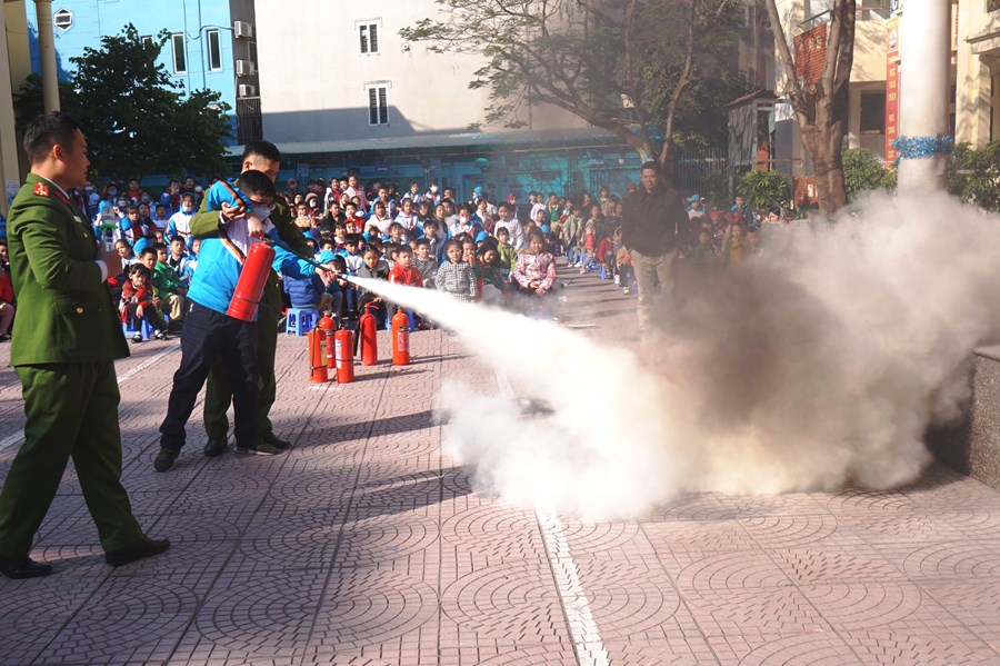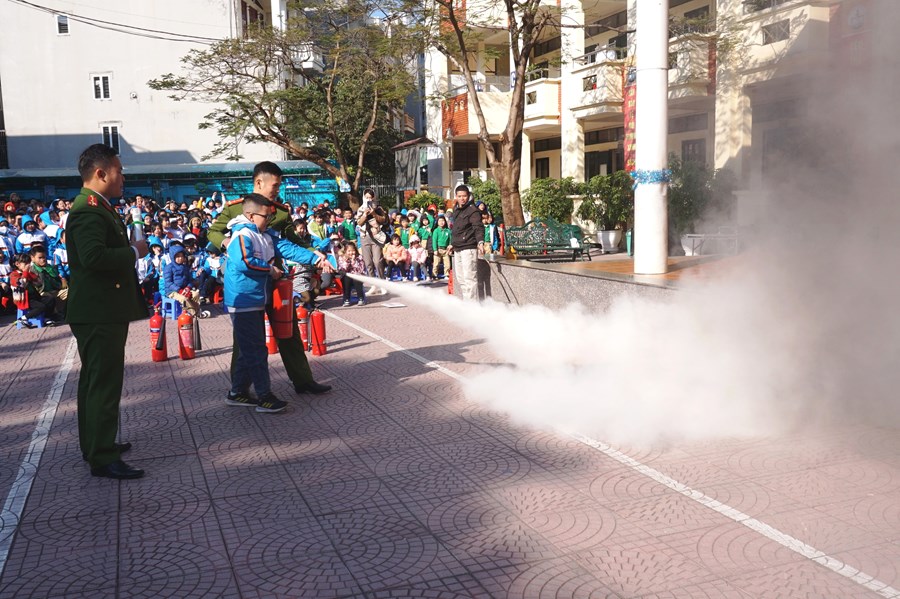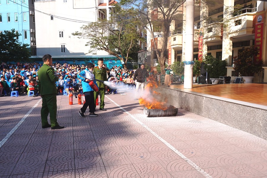 Tại buổi tập huấn, đồng chí Đỗ Quang Thái - Cán bộ Đội Cảnh sát PCCC và CNCH của công an Quận Ngô Quyền đã truyền đạt những kiến thức cơ bản về PCCC, một số nguyên nhân có thể gây cháy tại trường học và một số biện pháp PCCC tại trường học. Từ đó đ/c tư vấn cách sử dụng điện trong trường học, cách sử dụng các phương tiện chữa cháy tại chỗ và thực hành dập lửa bằng bình chữa cháy xách tay và một số kỹ năng thoát nạn an toàn trong đám cháy.
