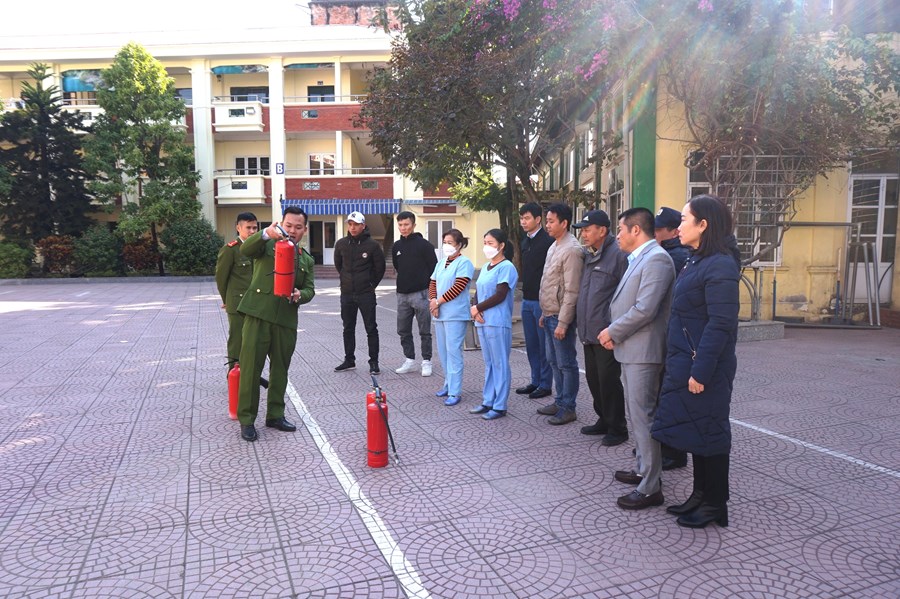 Sau buổi học lý thuyết, cán bộ, giáo viên, nhân viên và học sinh trong nhà trường đã thực hành cách sử dụng các phương tiện bình bột, bình CO2 để dập tắt đám cháy giả định.