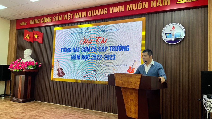 Về dự và phát biểu khai mạc, Hội thi vinh dự được đón thầy giáo Trần Nguyên Lâm, Bí thư Chi bộ, Hiệu trưởng nhà trường. Với sự quan tâm sâu sắc đến việc dạy học và rèn luyện phát triển toàn diện cho học sinh về Văn - Thể - Mỹ, thầy đã động viên và khích lệ các em rất nhiều, mong muốn giúp các em tự tin, chủ động phát triển năng khiếu bản thân, tạo được tinh thần tốt hỗ trợ cho học tập đạt kết quả cao.